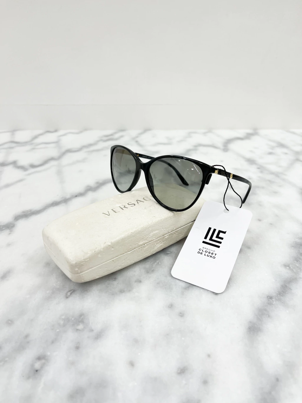Óculos Versace de acetato na cor preta, logo nas hastes, lentes pretas pretas e ferragens douradas.