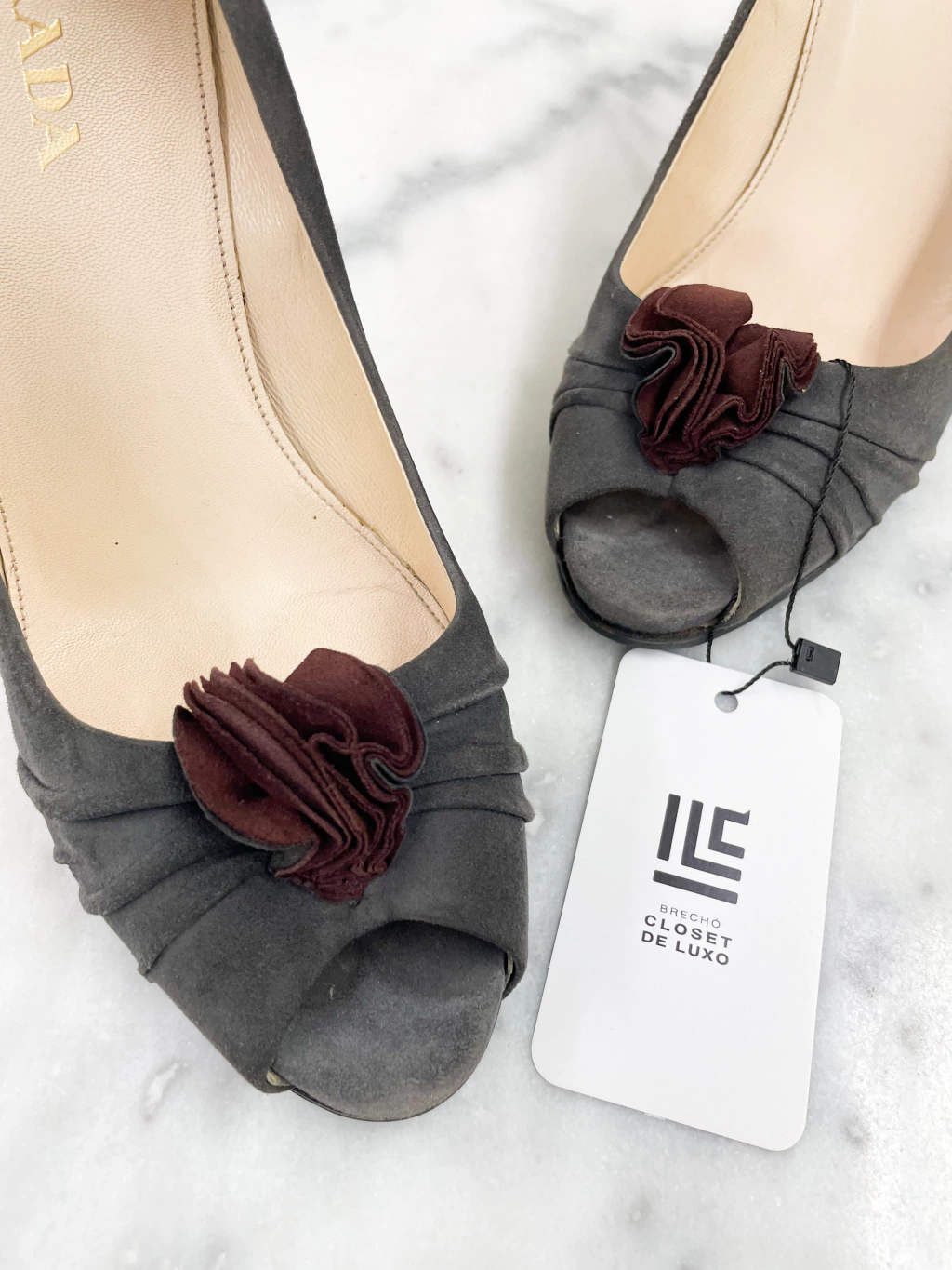 Peep Toe Prada de camurça na cor cinza com detalhe frontal em marrom e salto alto fino.