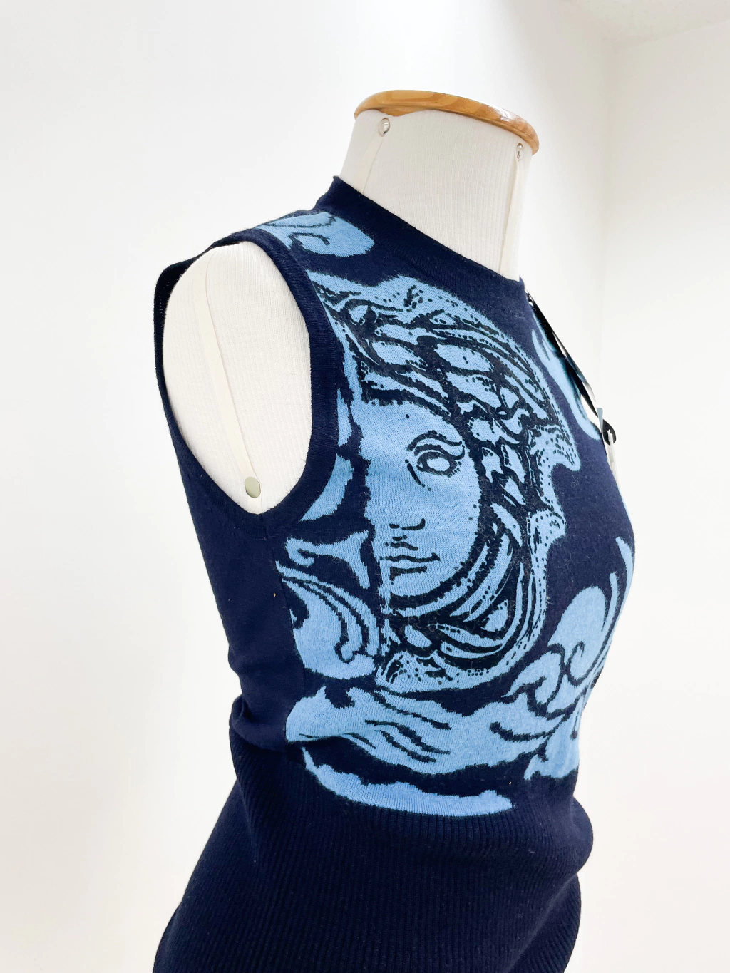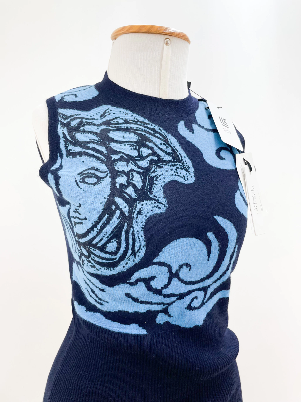 Pullover Versace tecido viscose+lã nas cores azul e branco logo e logo frontal.