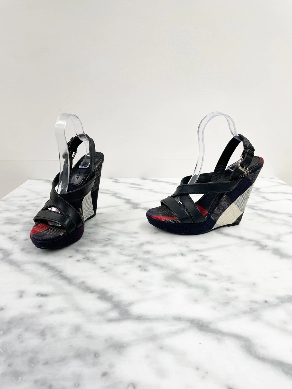 Sandália Burberry Platform Nova Check Wedge de tecido xadrez, couro preto, ajuste por fivela e salto alto plataforma com meia pata.