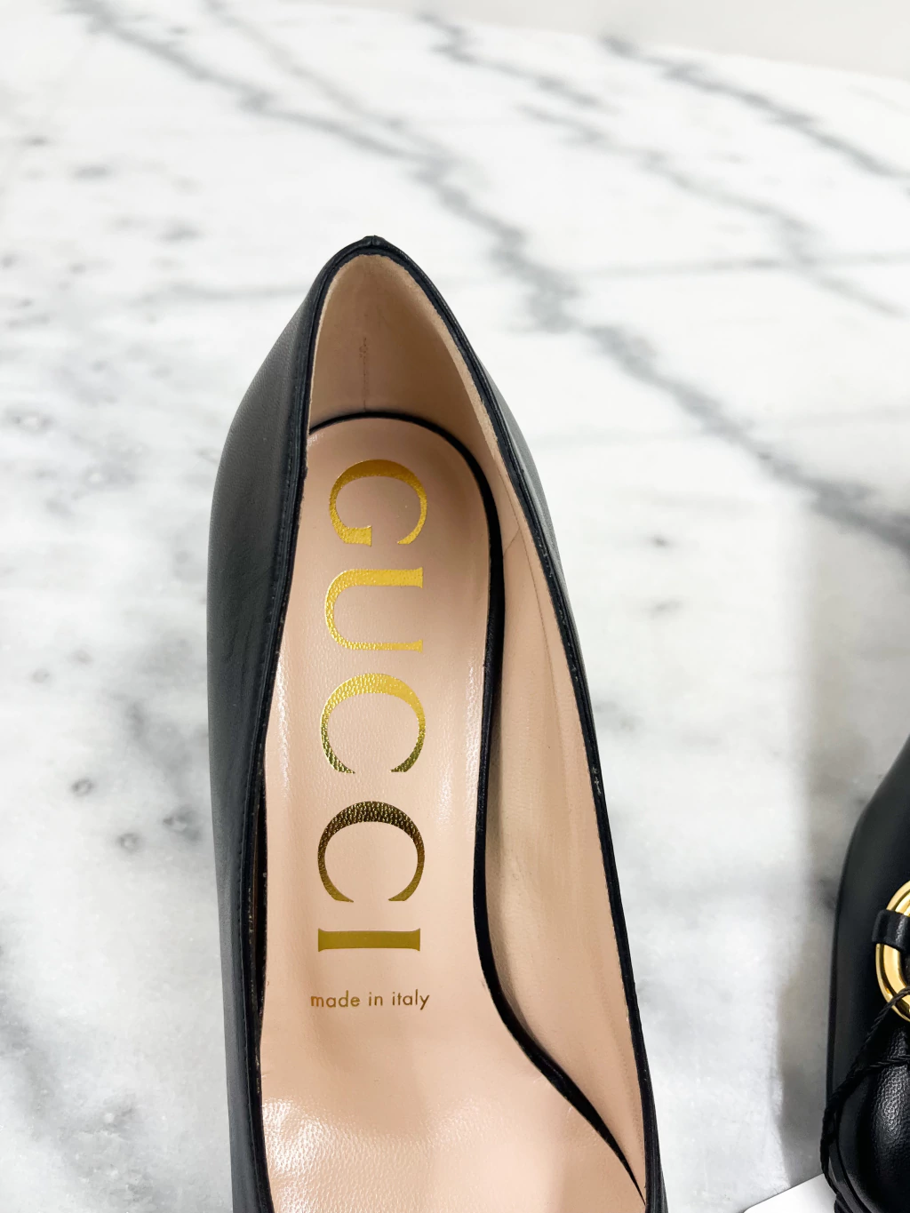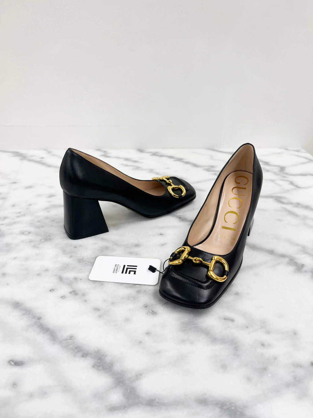 Sapato Gucci Horsebit Mid-Heel de couro preto, logo frontal Horsebit, ferragens douradas e salto bloco de tamanho médio com acabamento espelhado dourado.