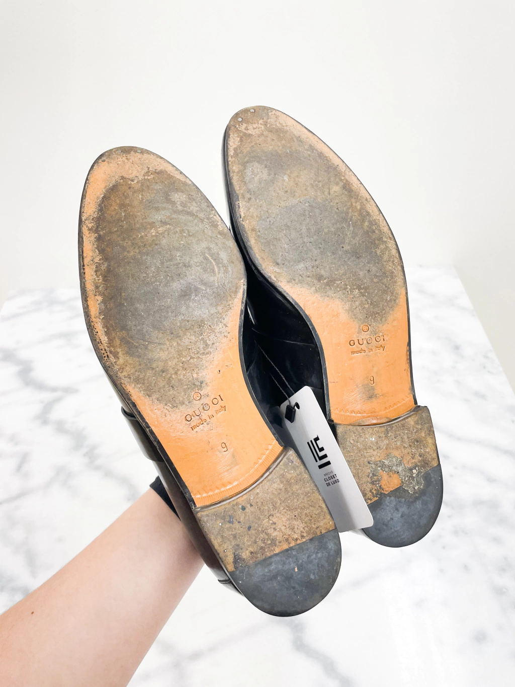 Sapato Gucci Interlocking GG Patent Leather de couro envernizado na cor preta, logo lateral e ferragens prateadas.