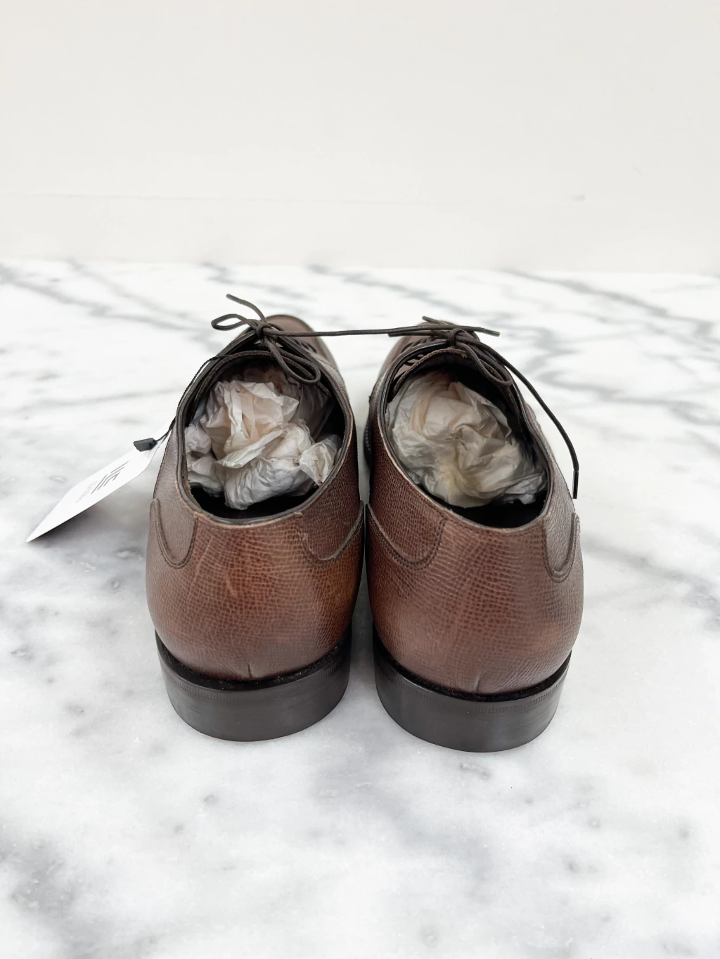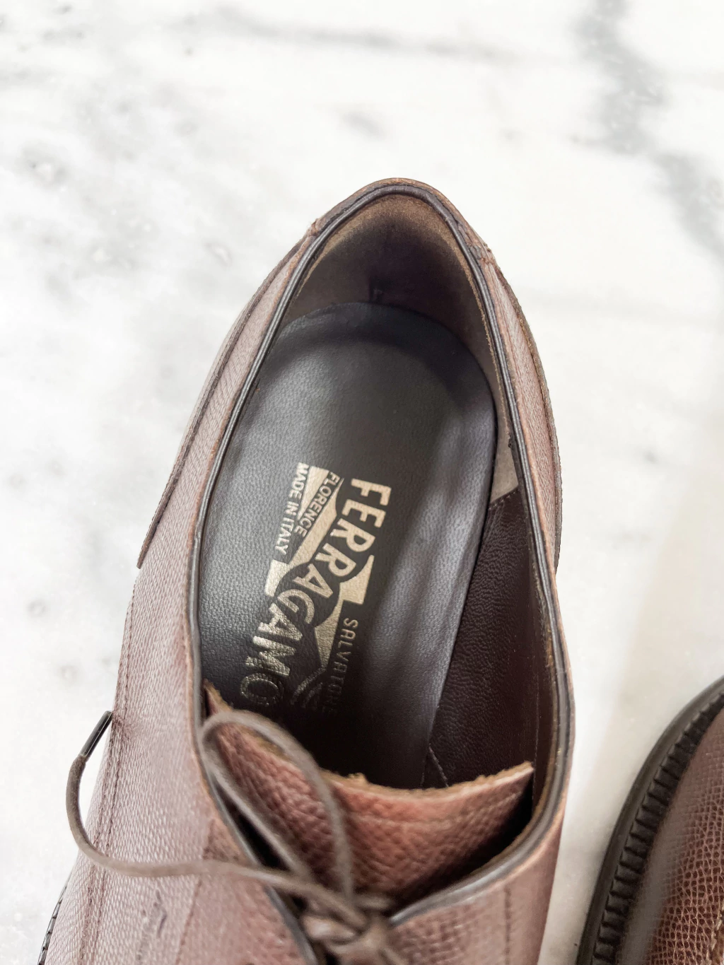 Sapato Salvatore Ferragamo de couro marrom, logo nas laterais e fechamento por cadarço.