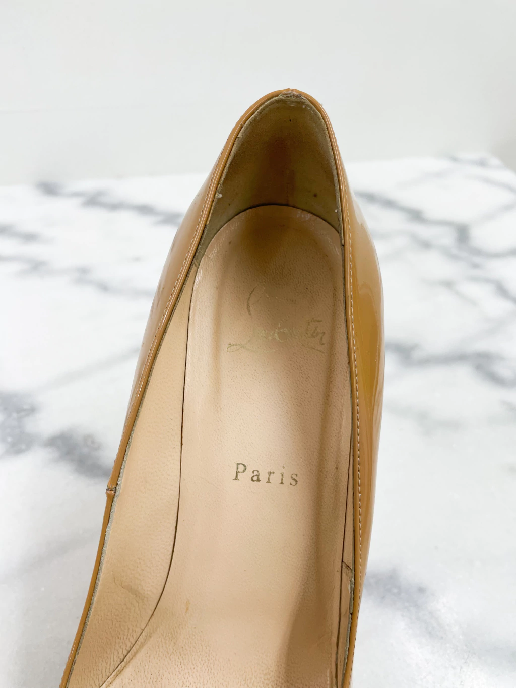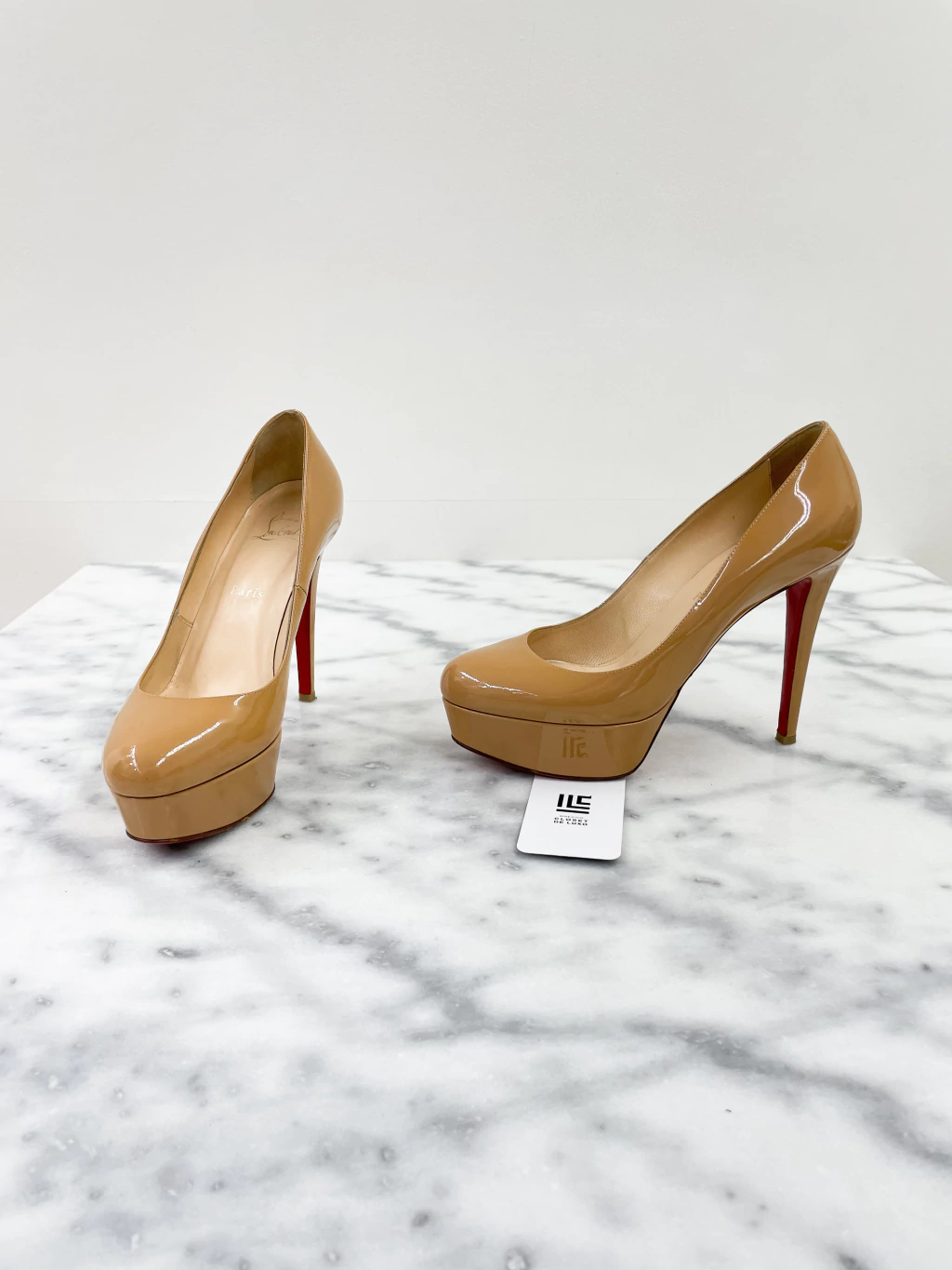 Scarpin Louboutin Bianca 140 de couro envernizado na cor bege, meia pata, salto alto fino e solado vermelho.
