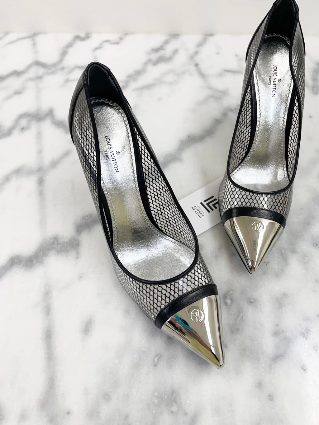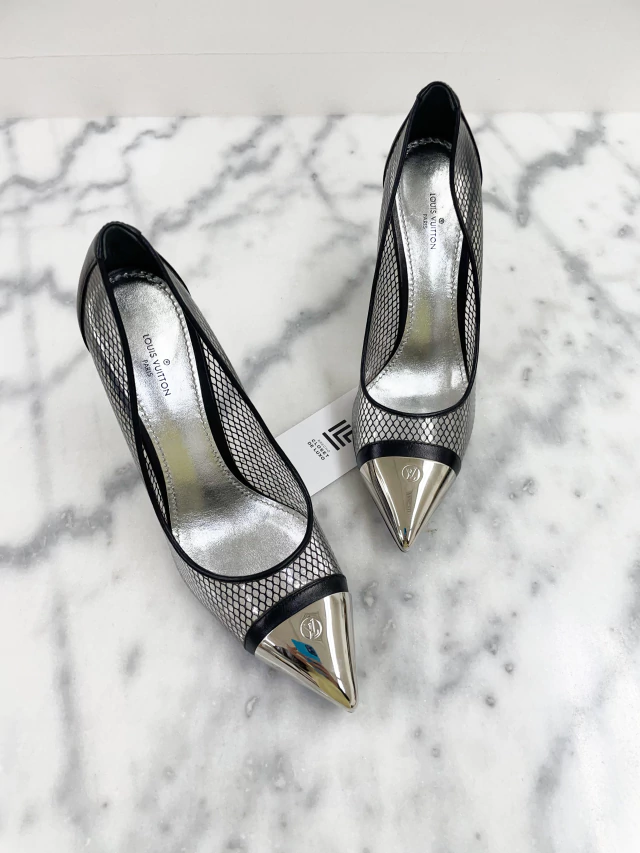 Scarpin Louis Vuitton Chérie Pumps de PVC com detalhes em telinha, couro preto e ponteira metelizada com logo frontal.