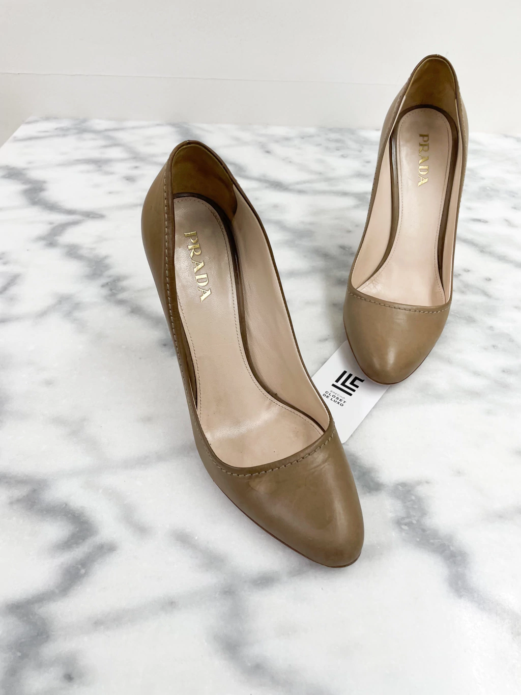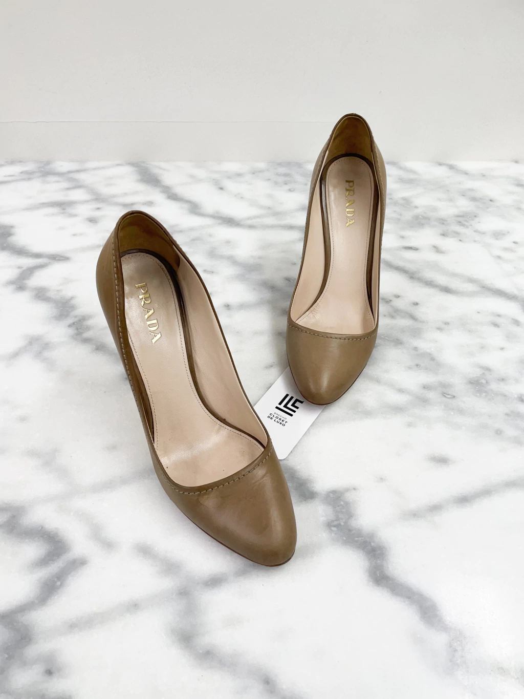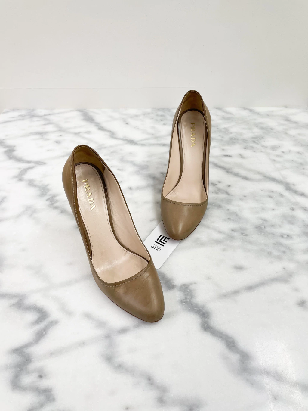 Scarpin Prada Leather de couro na cor marrom com salto alto fino.