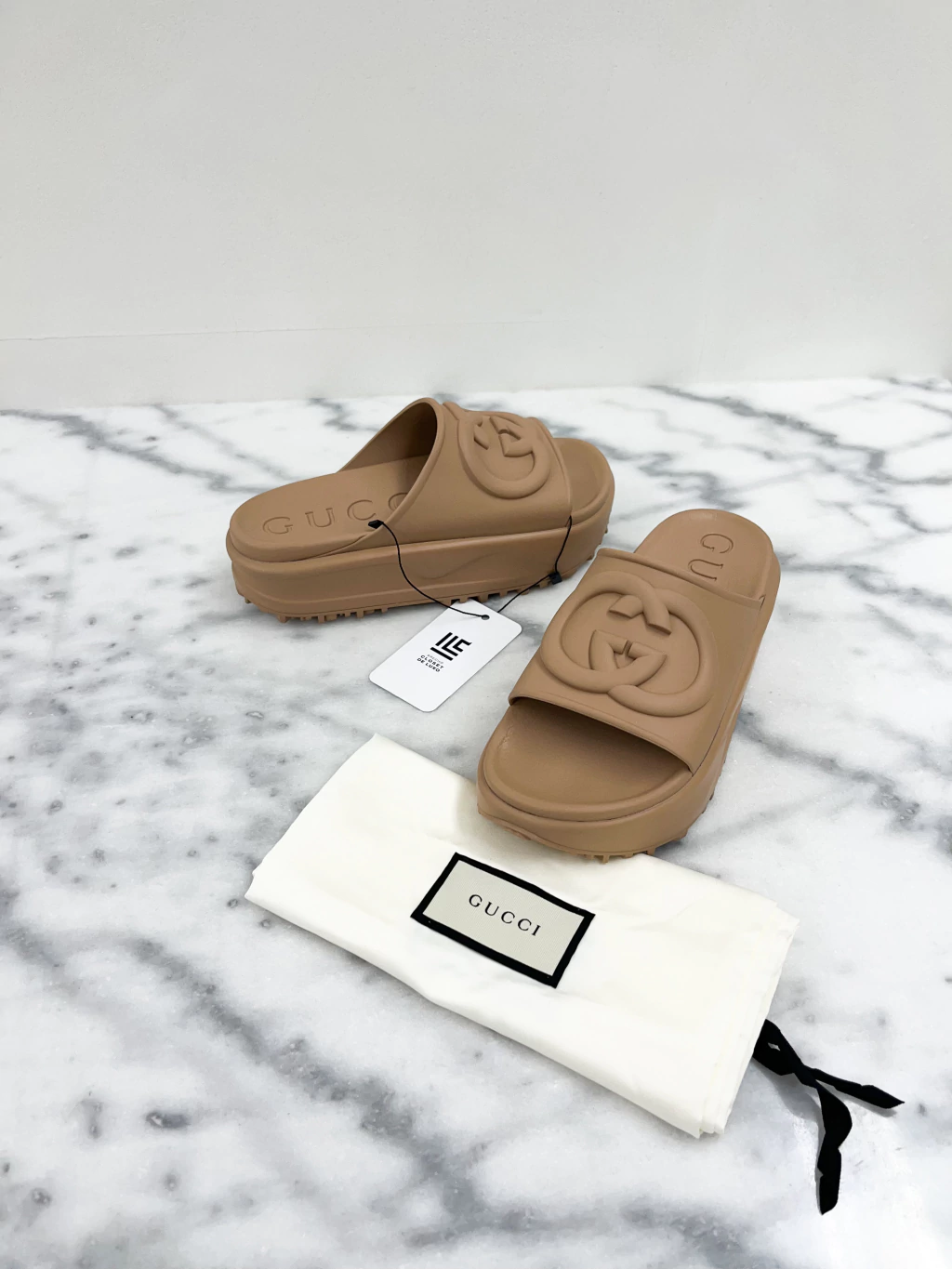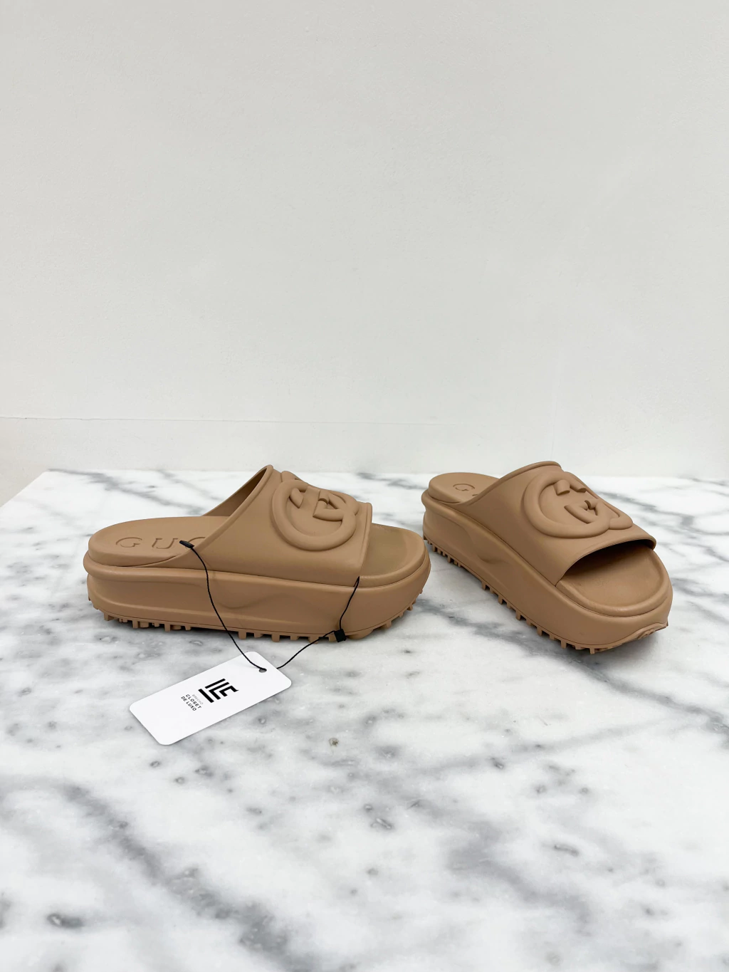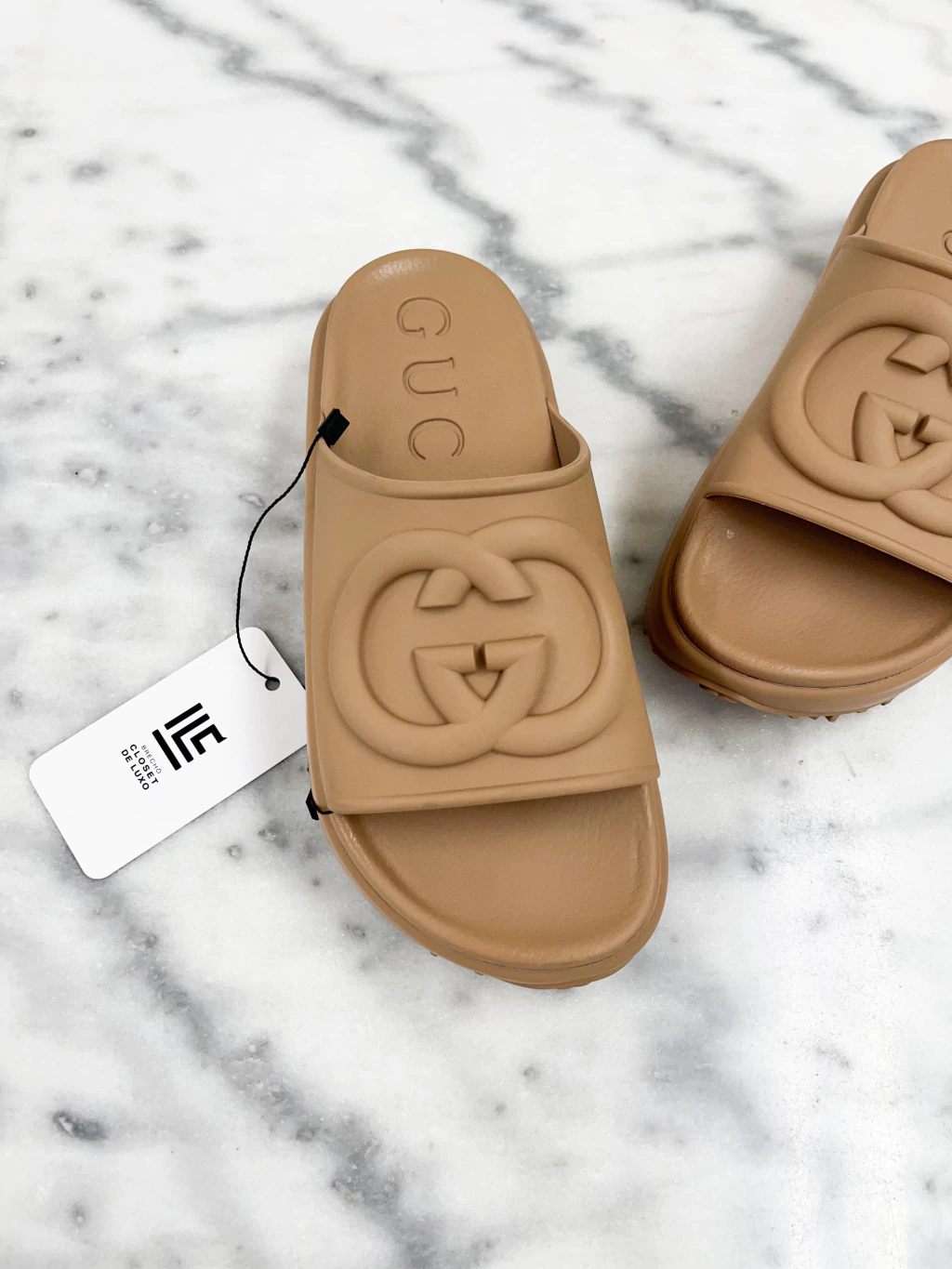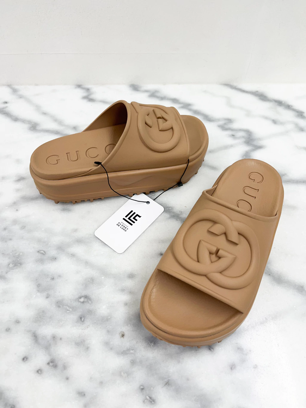 Slide Gucci GG Interlocking Rubber de borracha na cor marrom caramelo, logo frontal e solado plataforma.