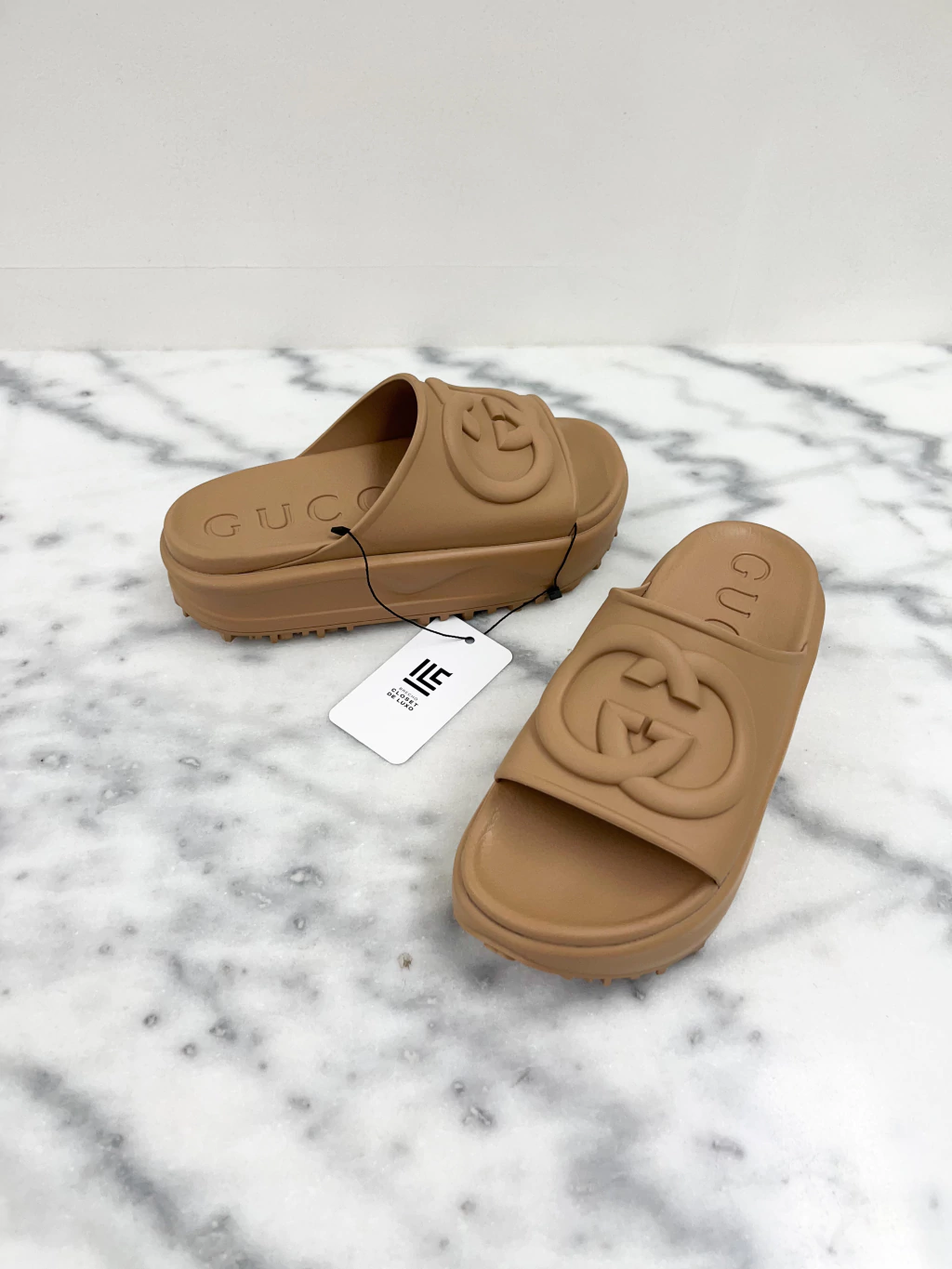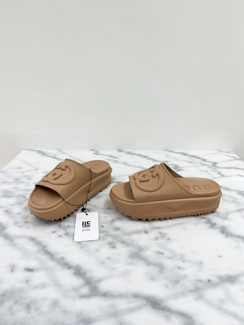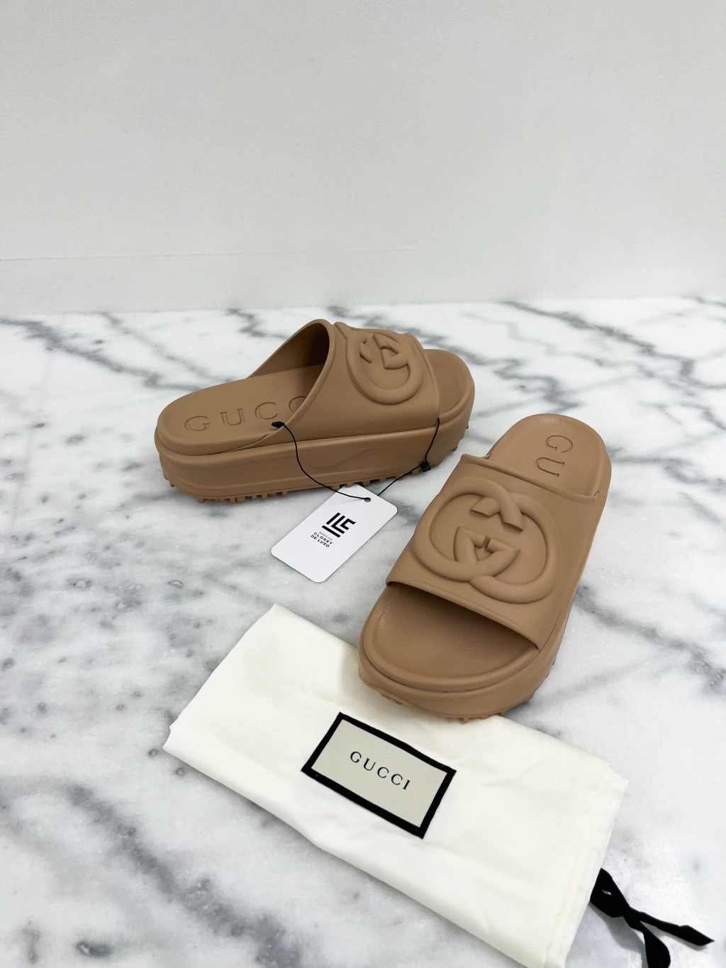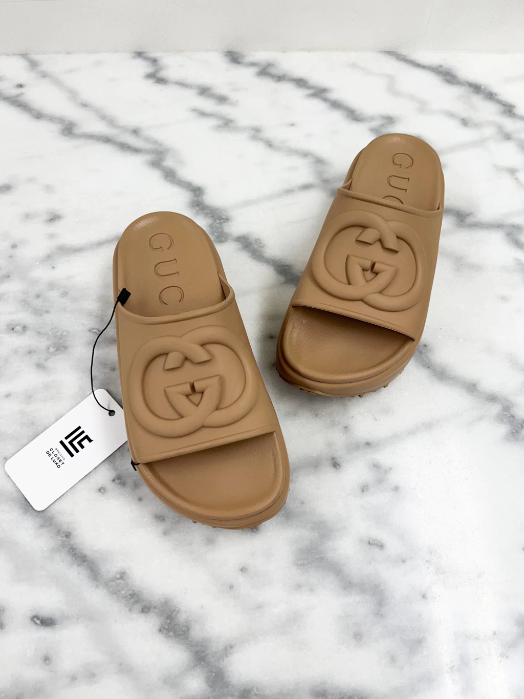 Slide Gucci GG Interlocking Rubber de borracha na cor marrom caramelo, logo frontal e solado plataforma.