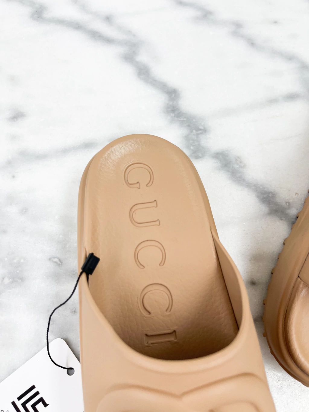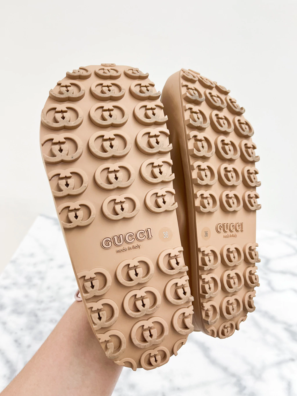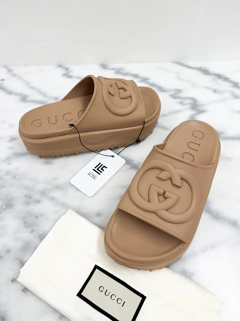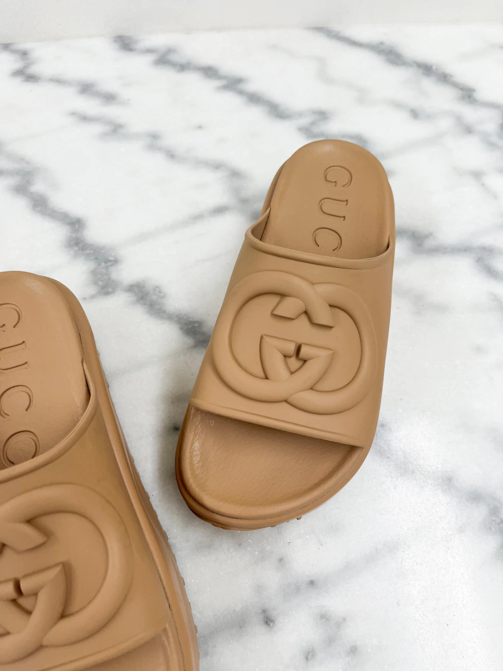 Slide Gucci GG Interlocking Rubber de borracha na cor marrom caramelo, logo frontal e solado plataforma.