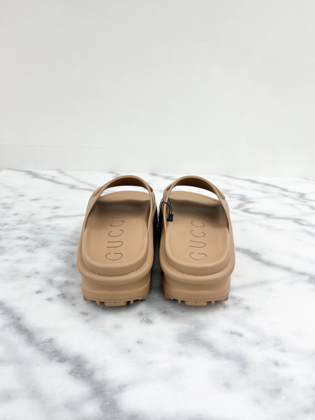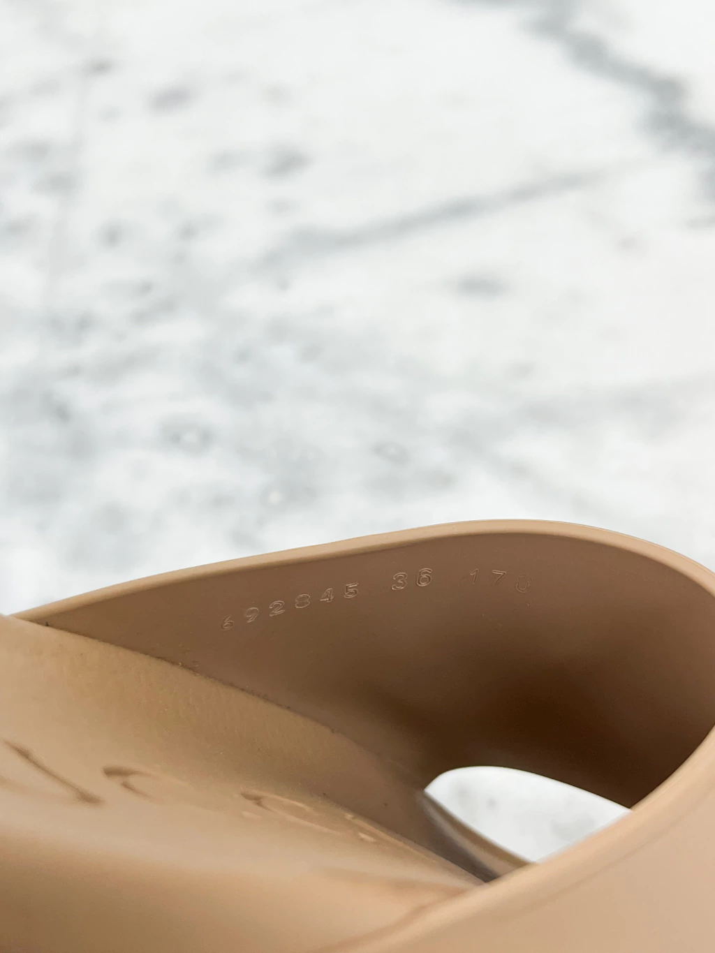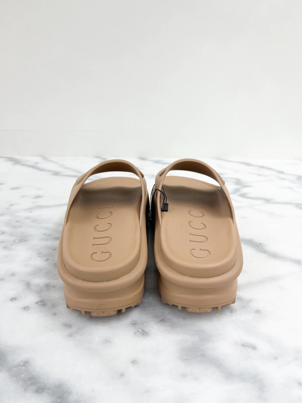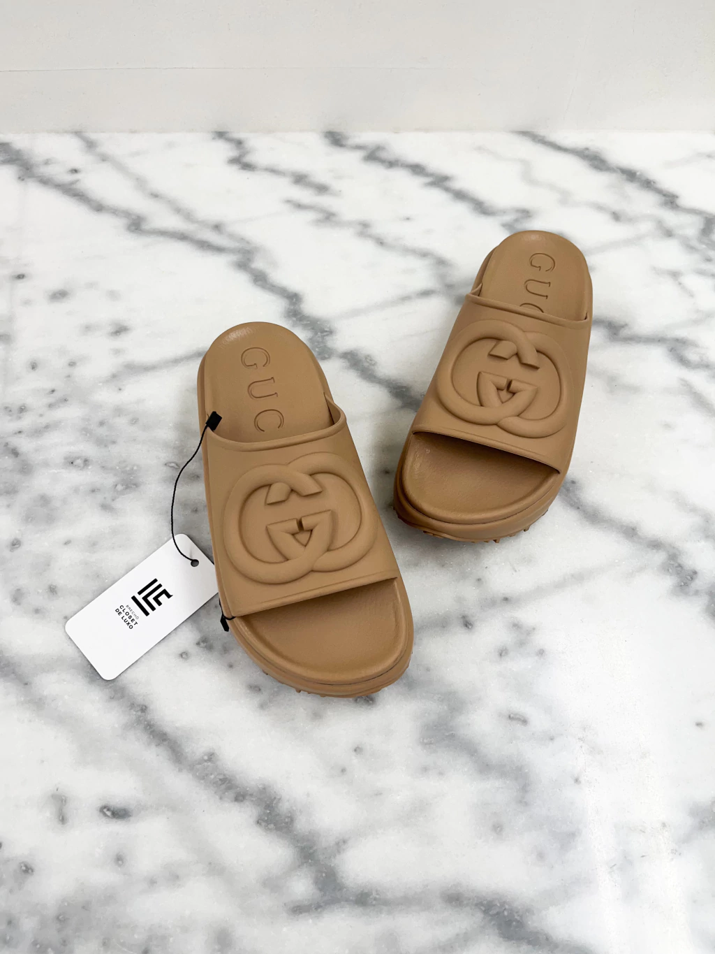 Slide Gucci GG Interlocking Rubber de borracha na cor marrom caramelo, logo frontal e solado plataforma.
