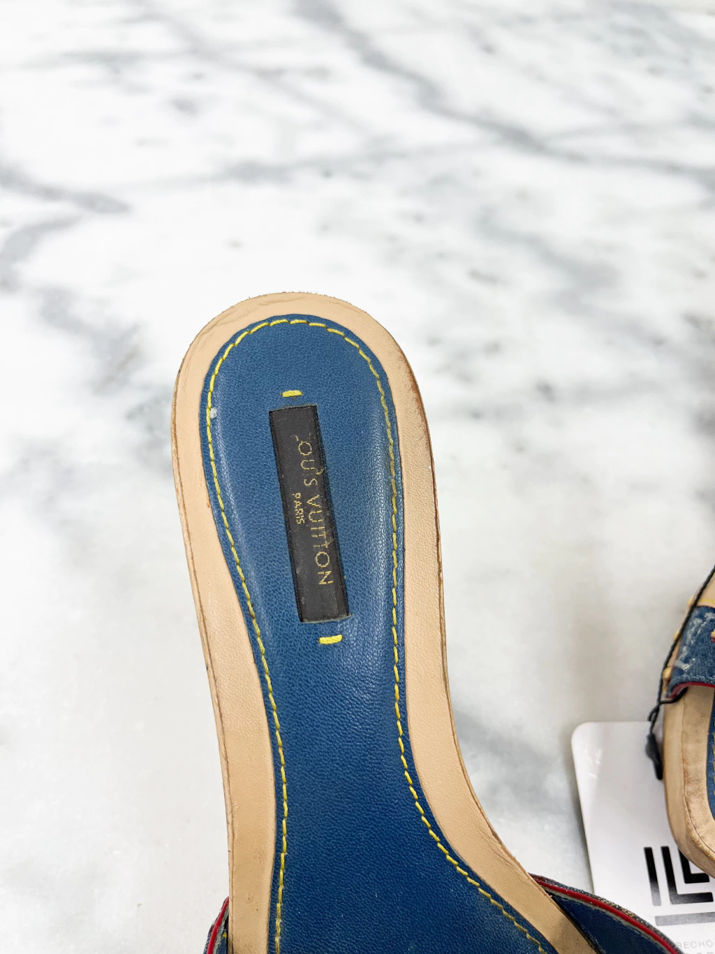 Tamanco Louis Vuitton Denim de tecido azul com estampa monograma, detalhes em couro bege, aplicações de studs, ferragens douradas, salto alto de tamanho médio e meia pata.