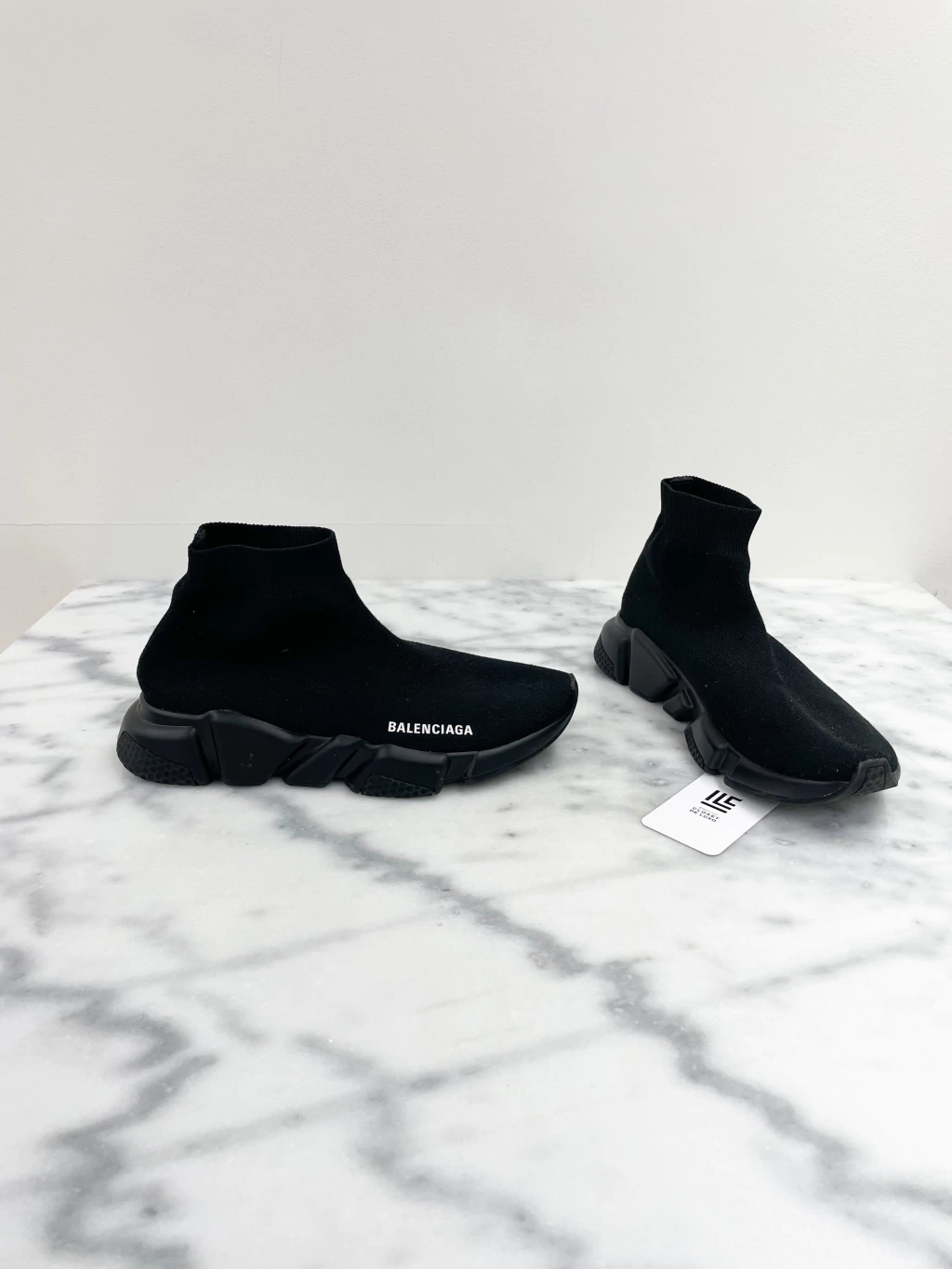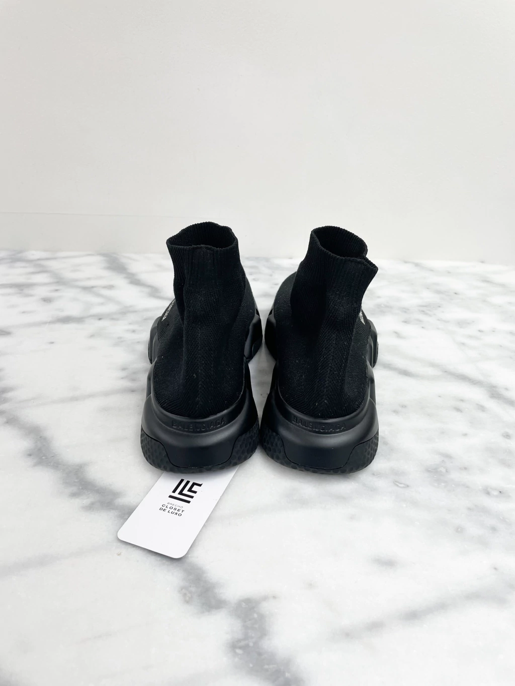 Tênis Balenciaga Speed 2.0 Knit de tecido na cor preta, logo nas laterais e parte de trás e entressola preta.