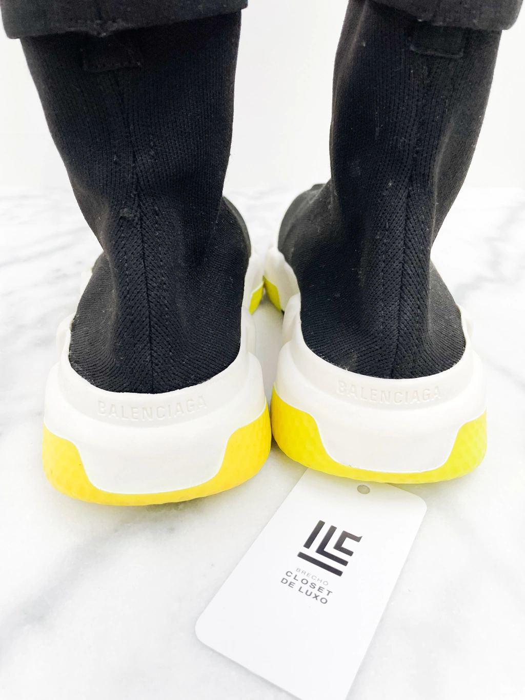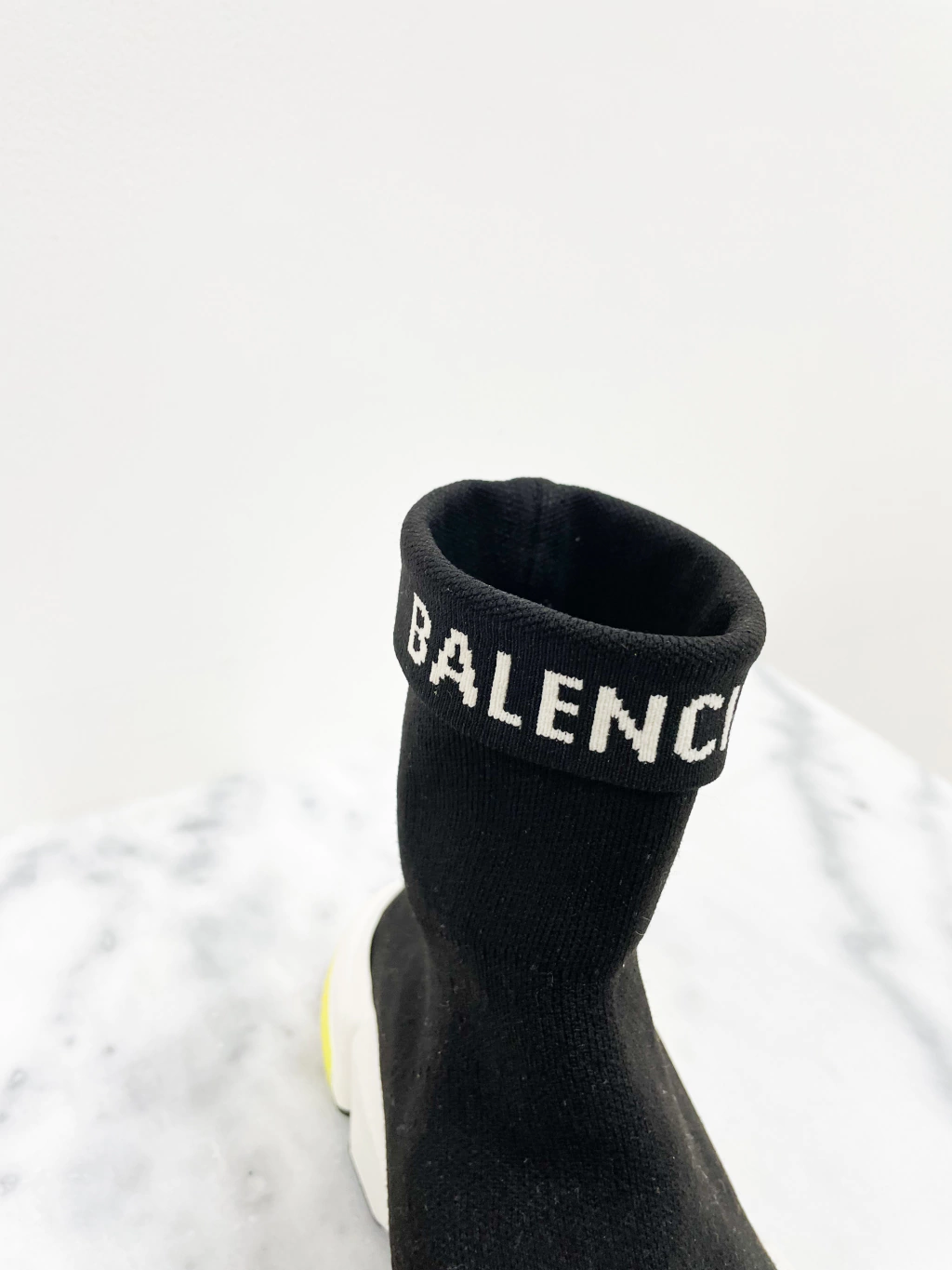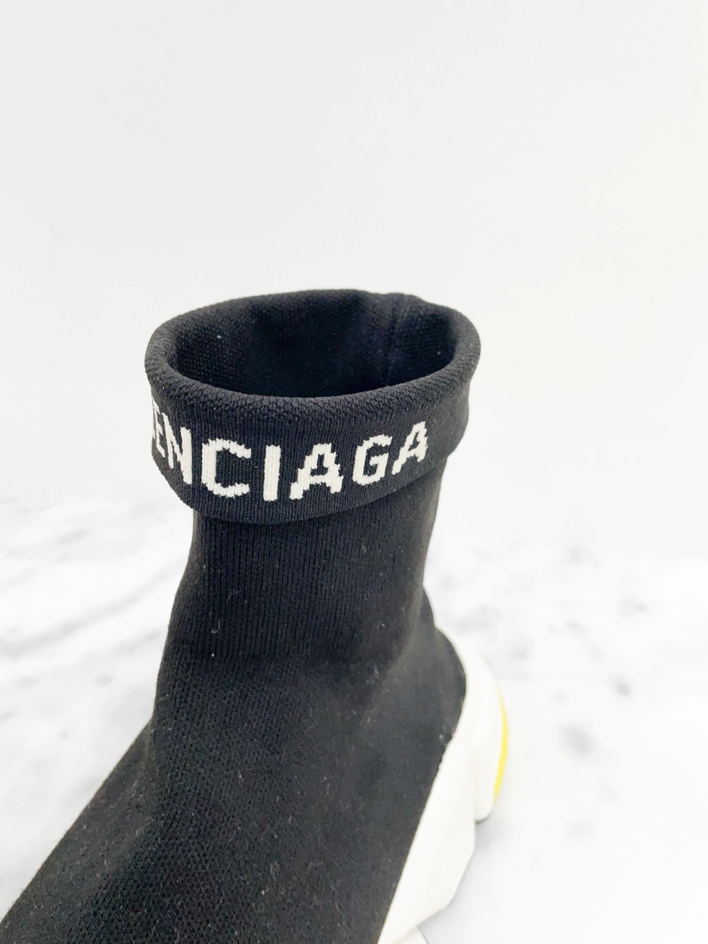 Tênis Balenciaga Speed Fold Logo Trainers de tecido elástico na cor preta, logo frontal e entressola branca com detalhes amarelos.