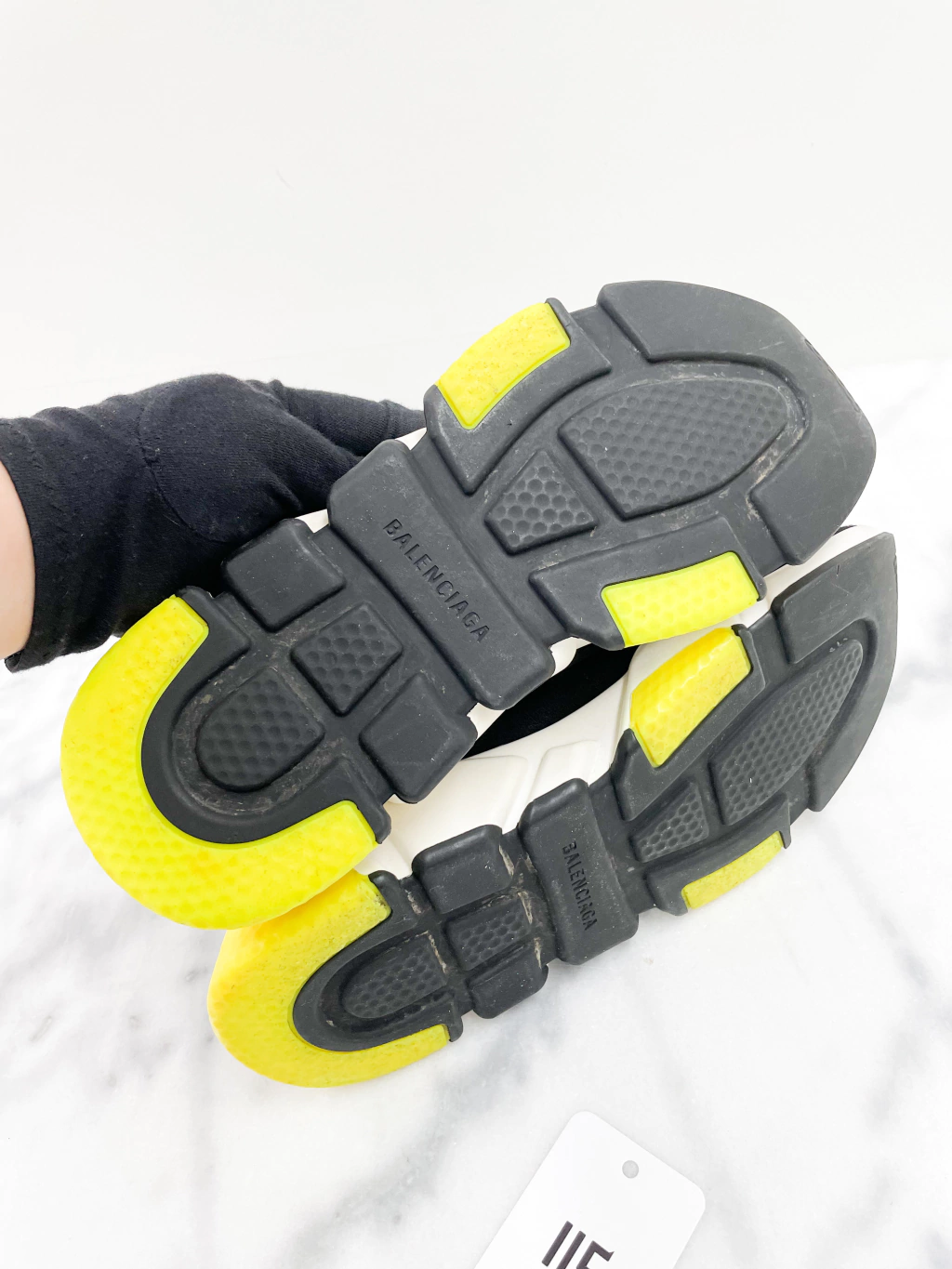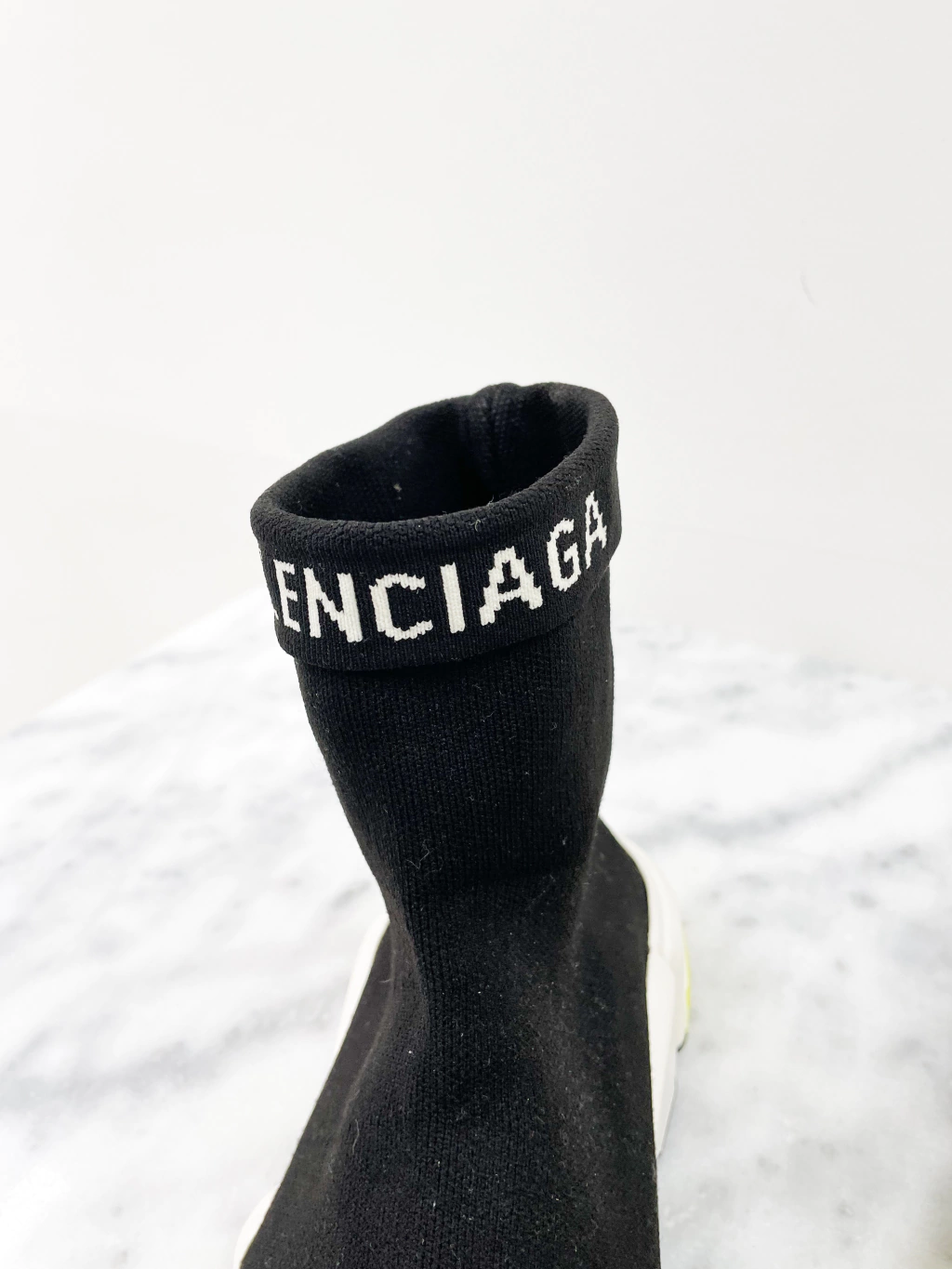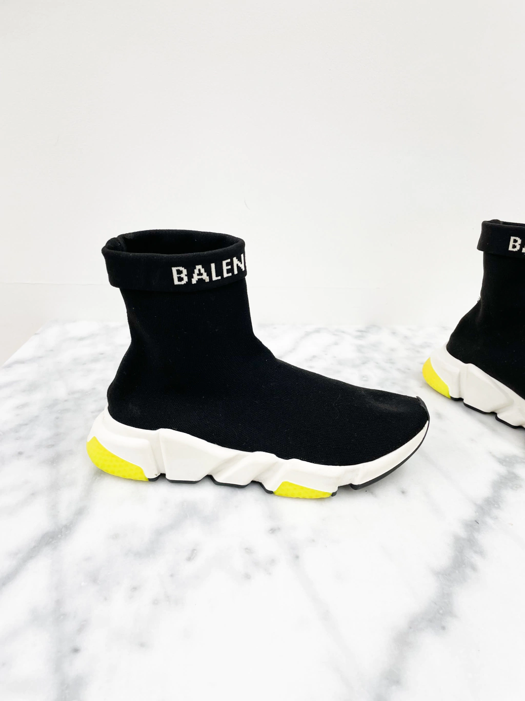 Tênis Balenciaga Speed Fold Logo Trainers de tecido elástico na cor preta, logo frontal e entressola branca com detalhes amarelos.