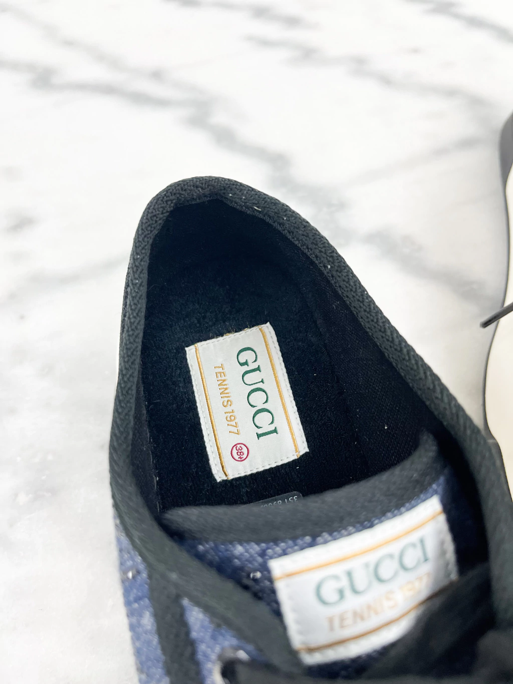 Tênis Gucci GG Denim Crystals Embellished de tecido jeans na cor azul escuro, estampa mongrama em strass, entressola branca e logo na língua e nas laterais.