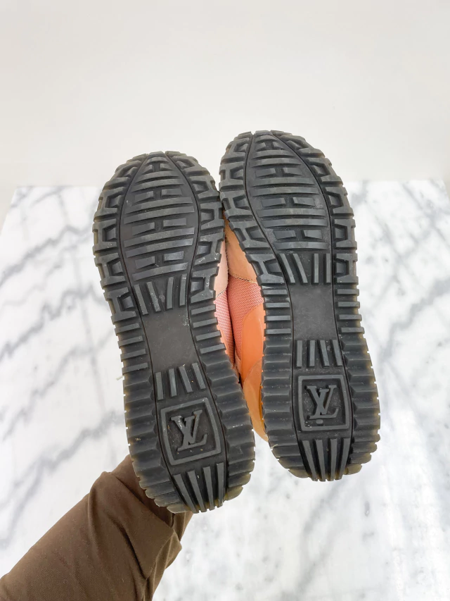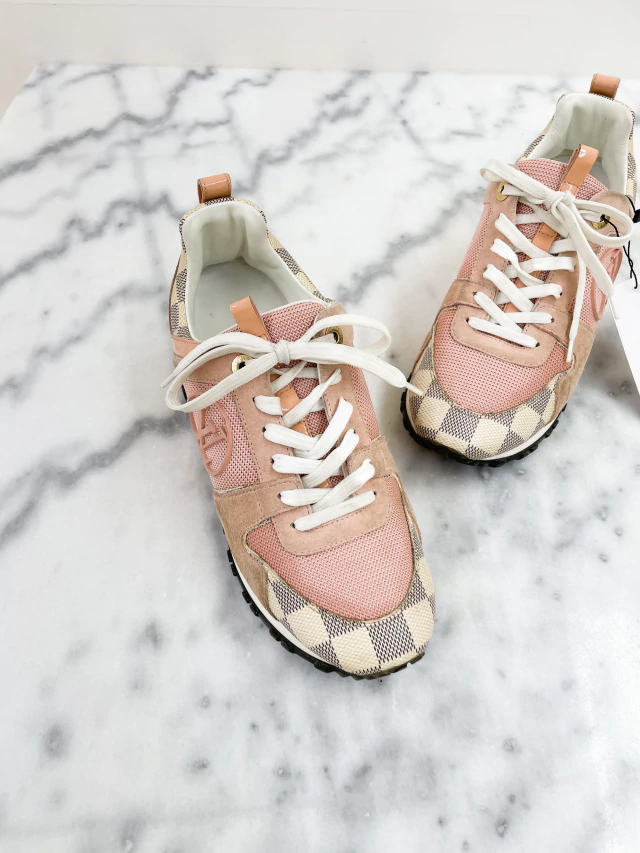 Tênis Louis Vuitton Run Away de suede e tecido na cor rosa, detalhes em canvas na estampa Damier Azur, logo nas laterais e parte de trás e detalhes em dourado.