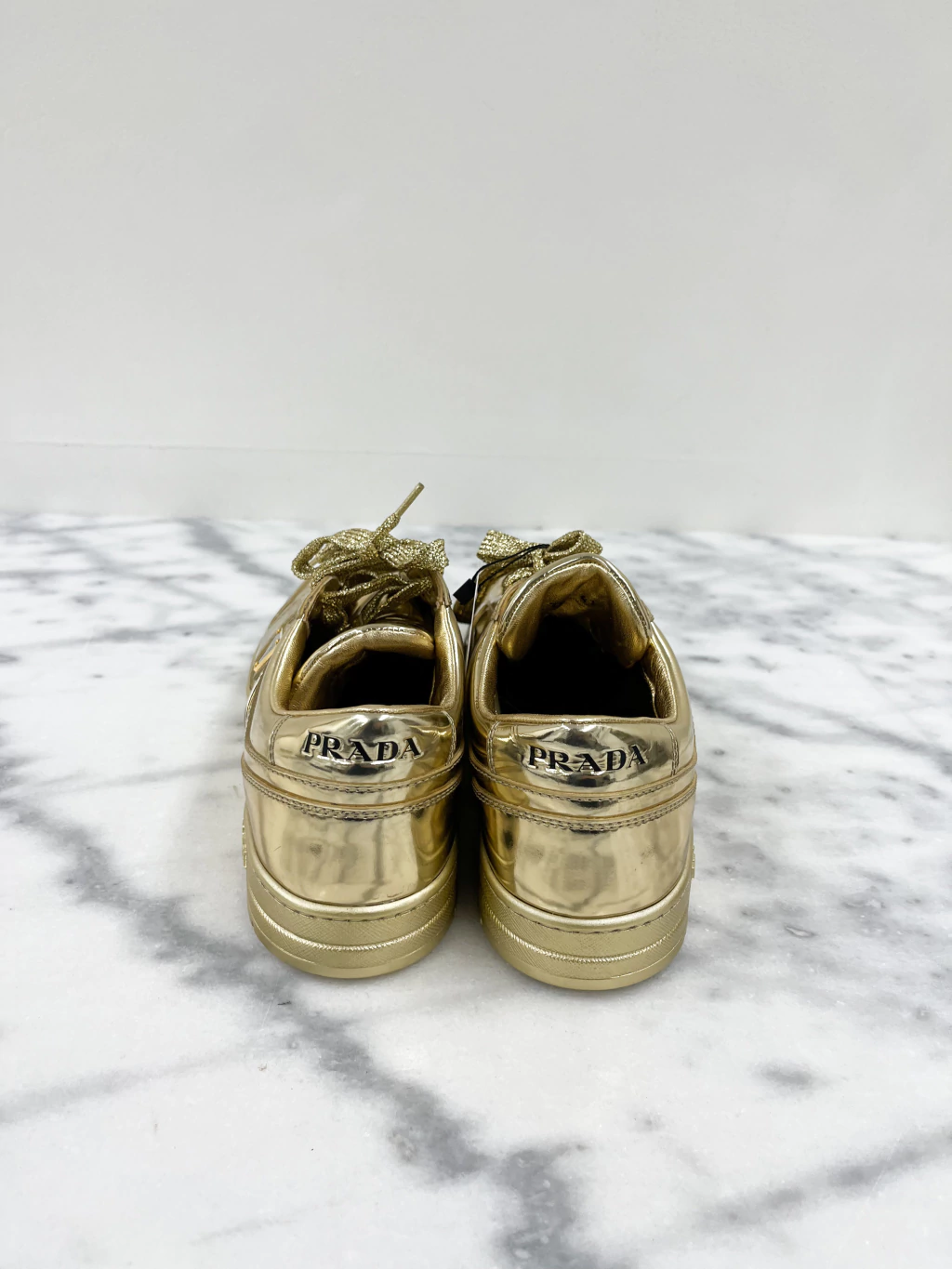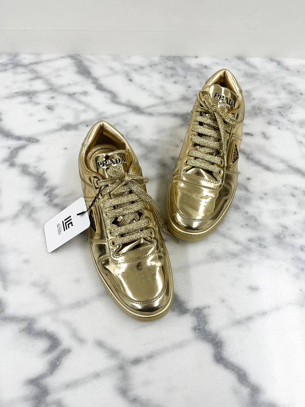 Tênis Prada Downtown Metallic de couro metalizado espelhado na cor dourada, logo nas laterais, língua e parte de trás e cadarço com fios metalizados.