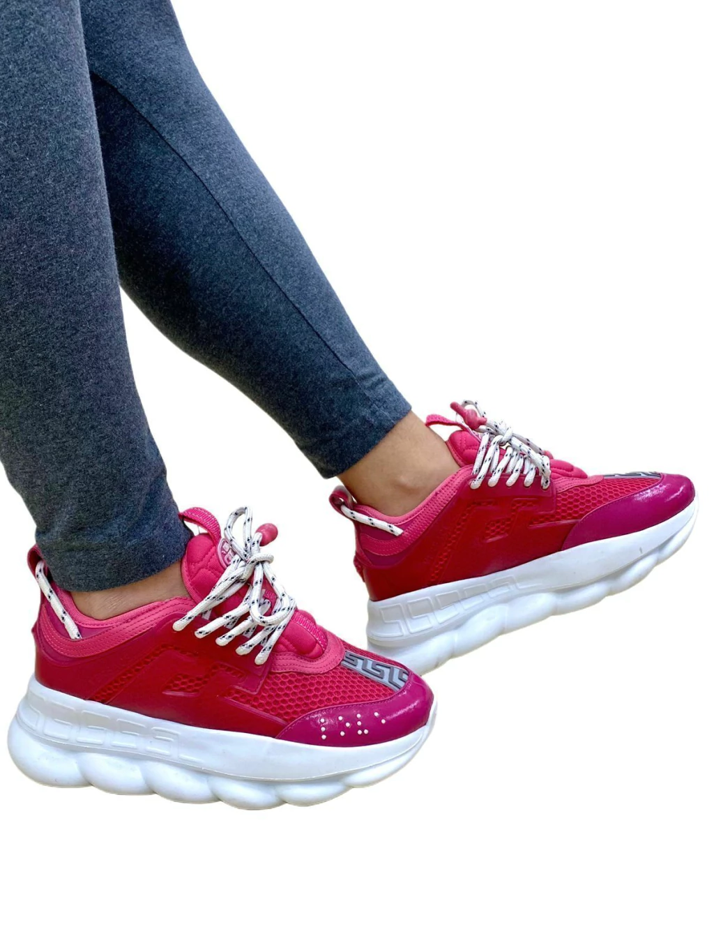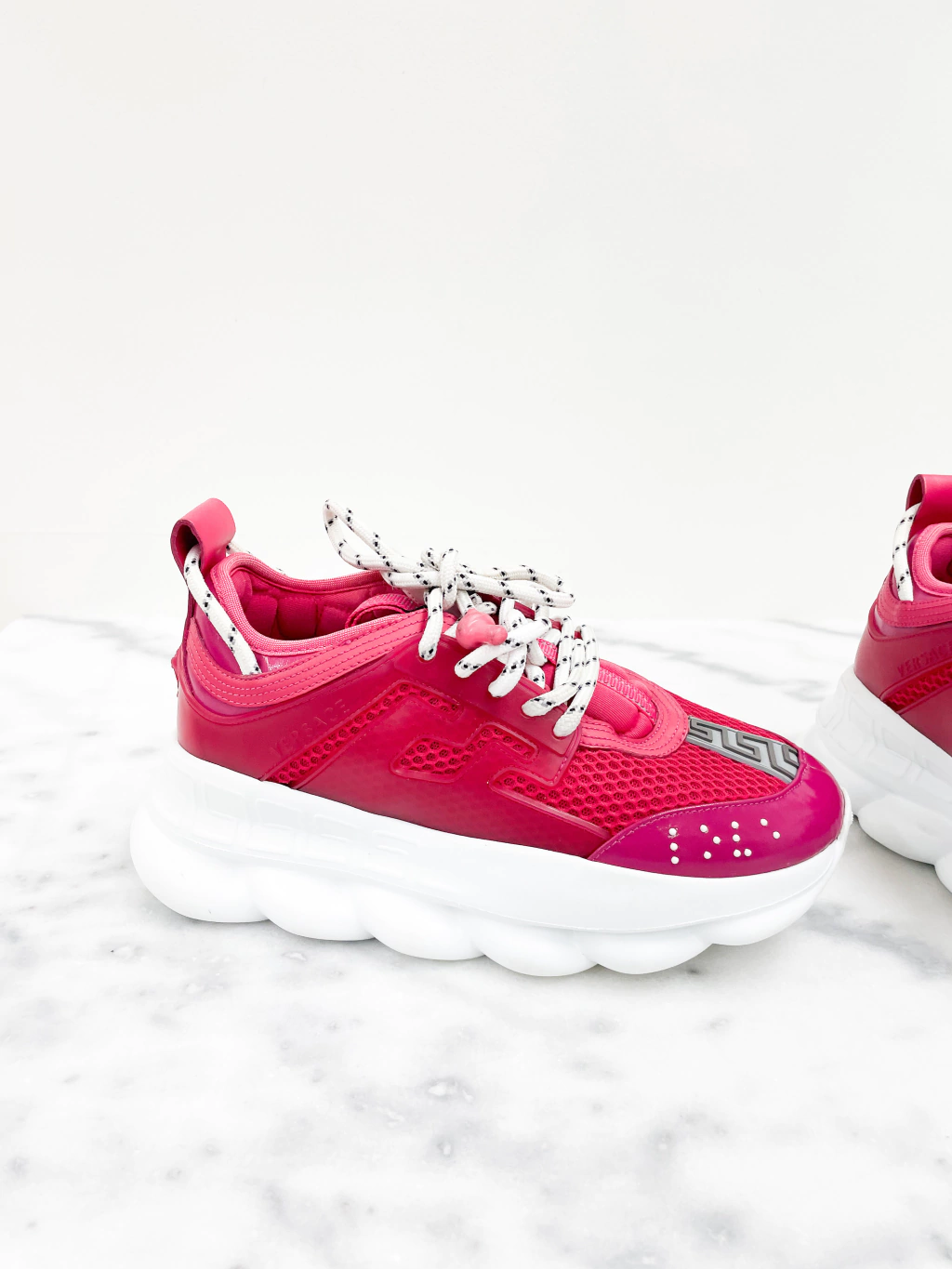 Tênis Versace Chain Reaction de couro, borracha e tecido na cor rosa, logo Medusa Head atrás e entressola branca.